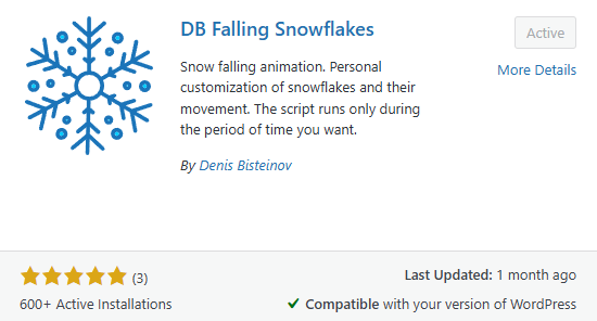 Leidsin pistikprogrammi DB Falling Snowflakes, laadisin selle alla ja aktiveerisin, pärast mida pistikprogramm töötas minu lehel.